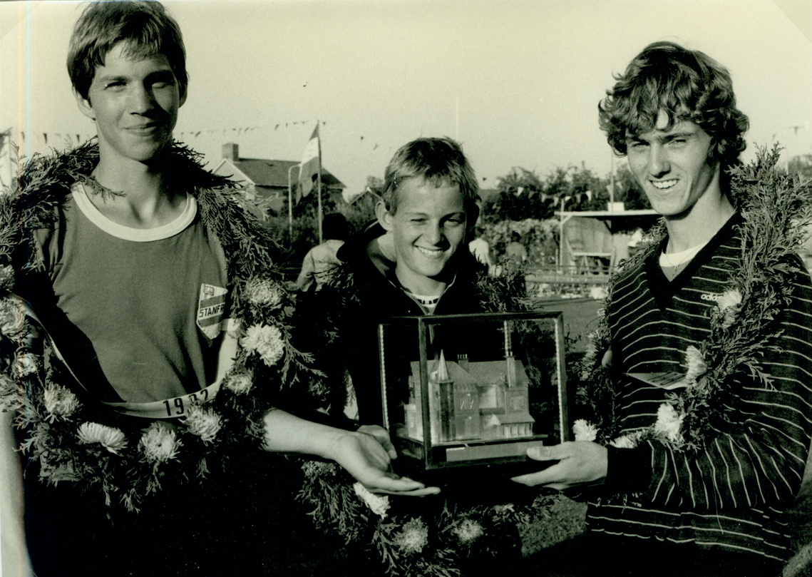 De 80ste Freulepartij in 1982 te Wommels met 53 parturen op de lijst. V.l.n.r.: Germ Zijlstra, Peter Tolsma met de wisselprijs De Villa van de Freule en André Tolsma, de winnaars van de eerste prijs voor de kaatsvereniging “Jan Reitsma” te Roordahuizum.